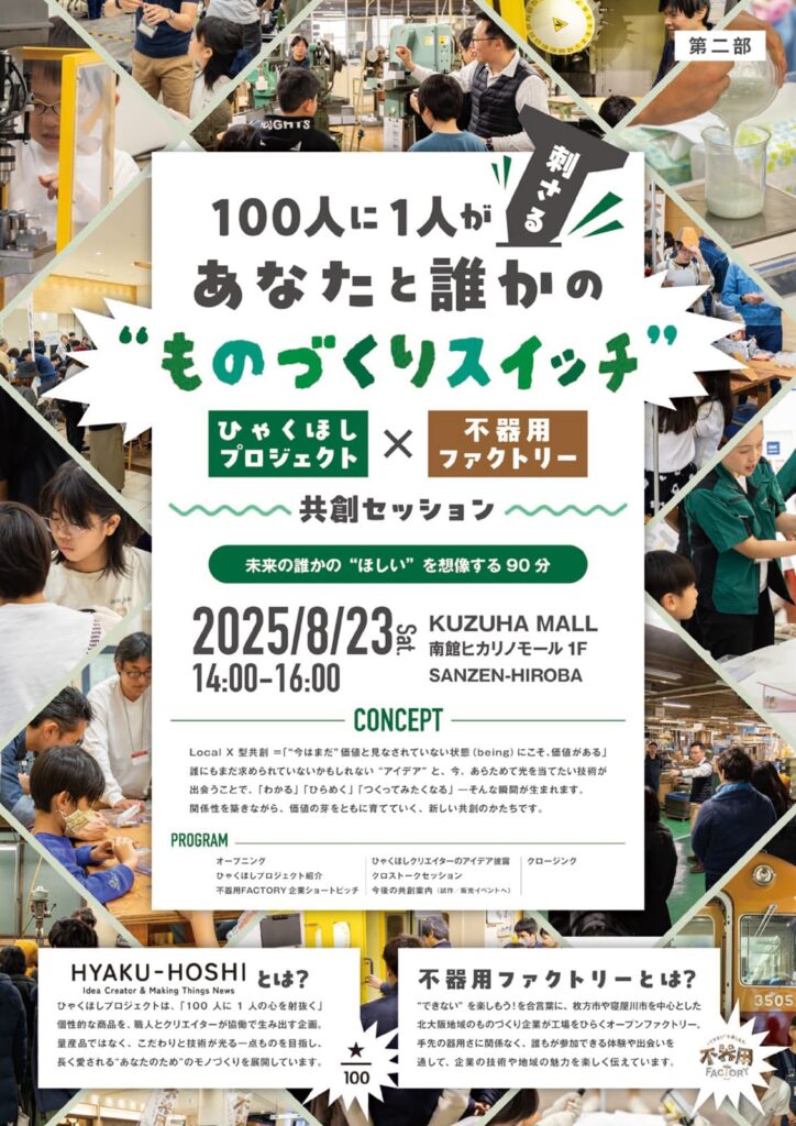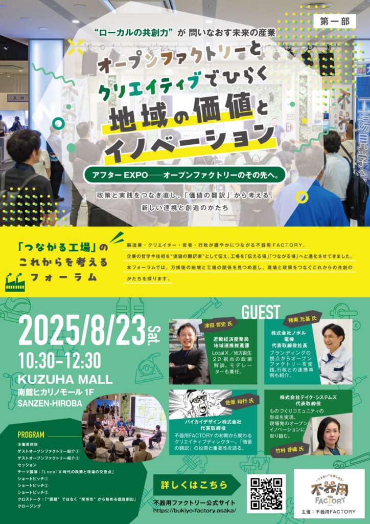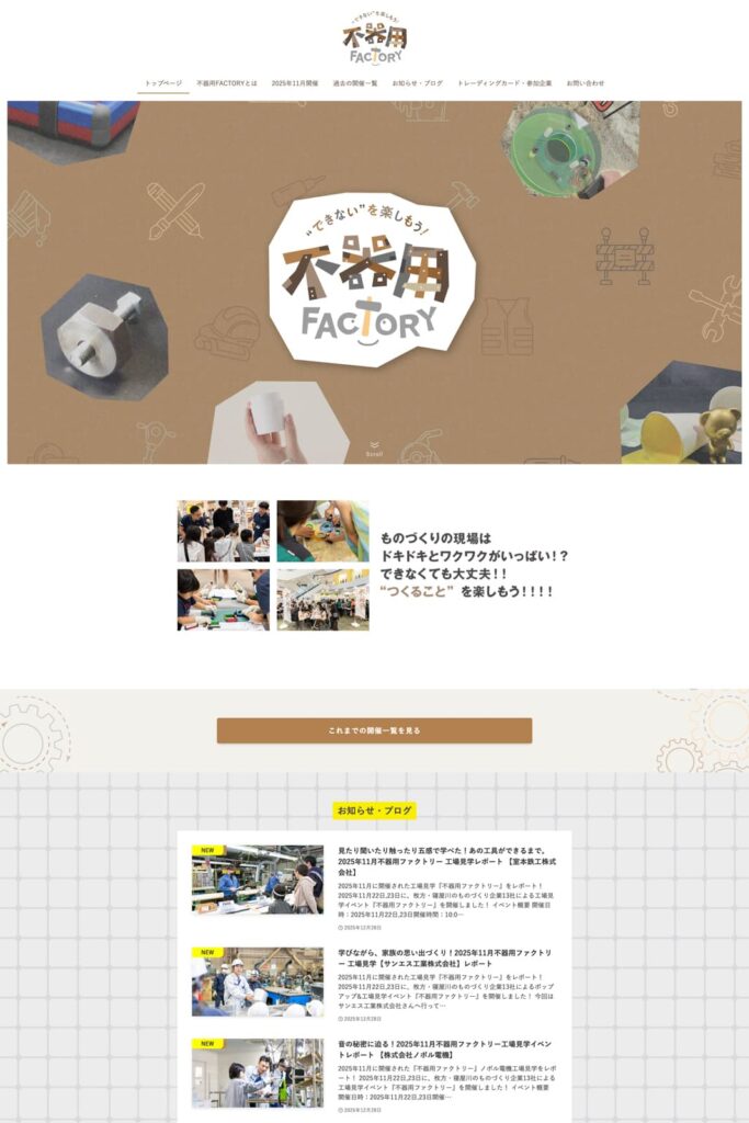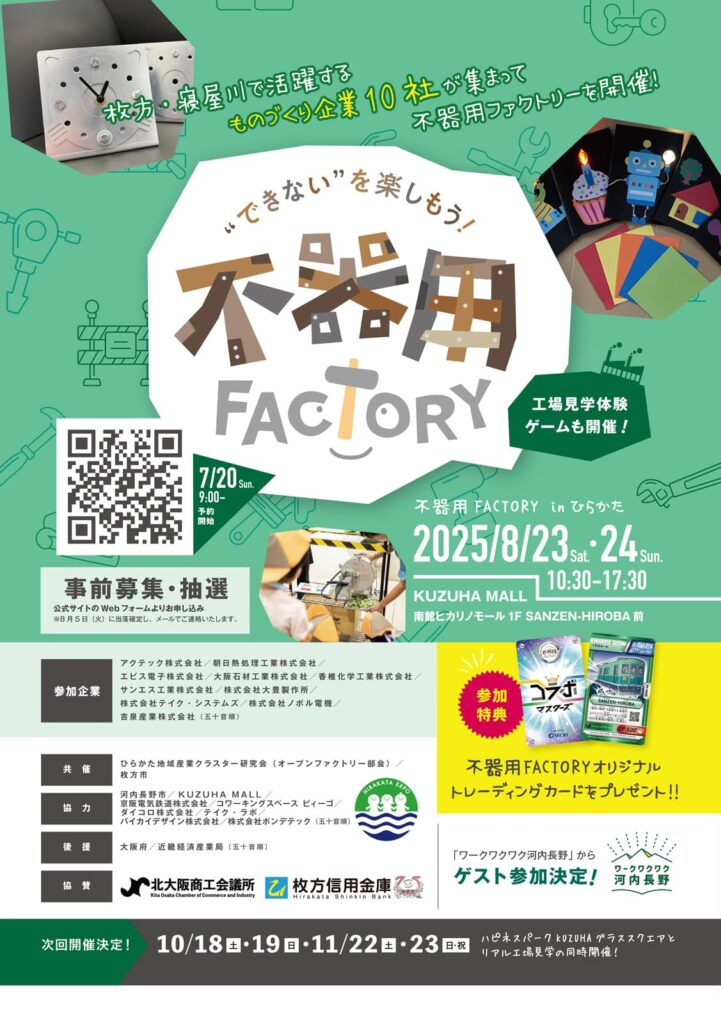 枚方市・寝屋川市・交野市のものづくり企業・行政・大学が連携して実施しているオープンファクトリー、「不器用ファクトリー」の制作・事務局を立ち上げ時から担当させていただいております。